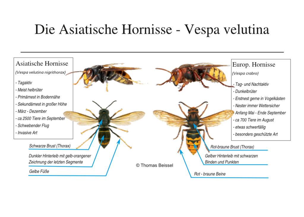 Bei der asiatischen Hornisse (lat. Vespa Velutina Nigrithorax) handelt es sich um eine nicht einheimische invasive Art. Eingeschleppt im Jahre 2004 in einem französischen Hafen, breitet Sie sich in Europa aus. In Deutschland sind im Jahre 2014 erste Meldungen der Sichtung dokumentiert. Seither breitet sich die asiatische Hornisse in Deutschland aus.